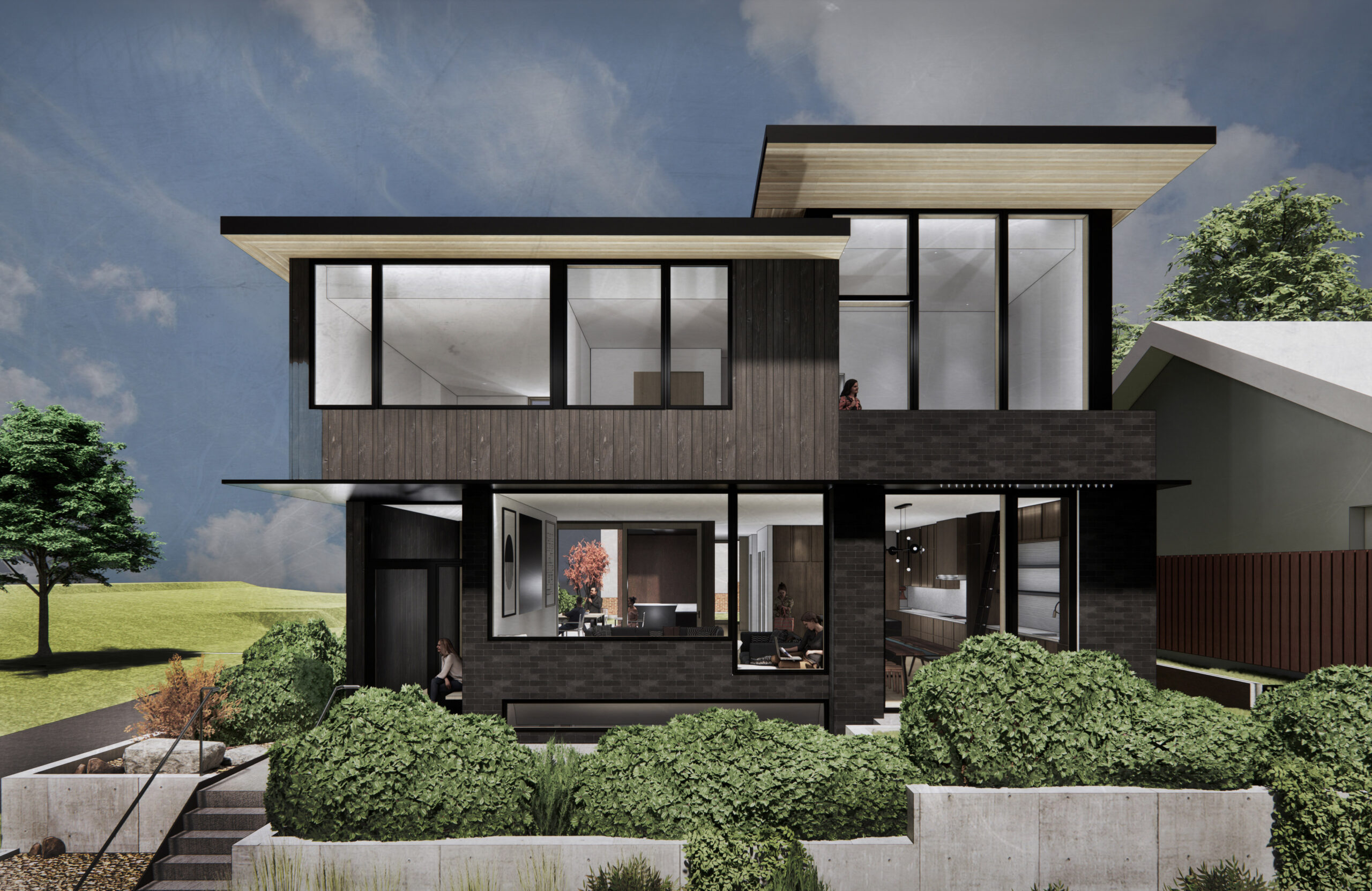 The main living space is conceived as an open, social heart of the home, anchored by a chef’s kitchen and generous dining area, with seamless connection to a west-facing courtyard that extends living outdoors. A restrained palette of natural materials—wood, Corten steel, and Richlite panels—was selected for their tactile quality, environmental integrity, and ability to weather gracefully with minimal maintenance. One of the home’s most defining architectural elements is its Cross Laminated Timber (CLT) roof structure, which serves as both structure and finish—spanning to create deep cantilevers that act as a solar parasol, precisely tuned for passive solar performance while celebrating the warmth and honesty of exposed timber.