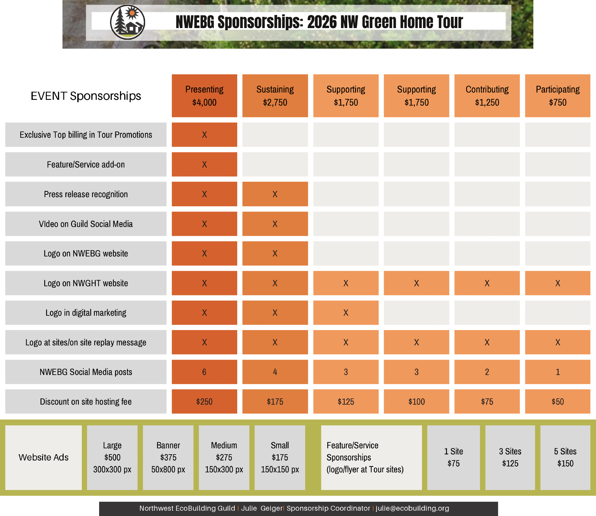 Each year, businesses and organizations, large and small, step forward to sponsor the NW Green Home Tour. This nonprofit educational event, which is 100% free to the public, depends on the generosity of our sponsors. We offer sponsorship packages to fit every budget, and our valued sponsors enjoy a wide range of perks. Showcase your business on the NW Green Home Tour and reach more customers with your green building message.